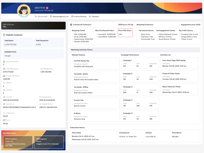 Our Customer 360 Profile connects every touchpoint—from engagement to transaction—into a single, intelligent view. Unlock real-time insights and AI-powered recommendations to upsell, cross-sell, and build deeper customer relationships with precision.